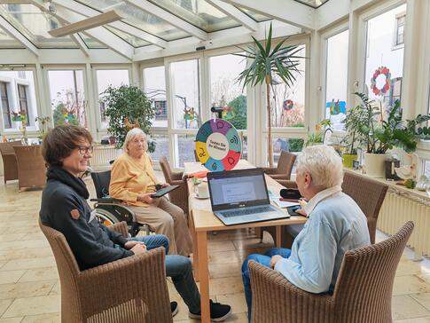 Im besagten Caritas Haus gab es dann den Vormittag über die Gelegenheit unserem Referenten alle möglichen Fragen rund um die digitale Welt zu stellen. Da der Andrang eher etwas verhalten war, profitierten vor allem die beiden Damen auf dem Foto von einem ausgiebigen Austausch mit Johannes und Frau Kraev vom Caritas Haus.
